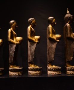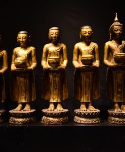 These figures were likely intended for display in a monastic hall or the shrine room of a wealthy patron. Their size and stylistic unity suggest a commissioned set, made for devotional contemplation and ceremonial use. While the provenance is undocumented, the stylistic fidelity, gilding method, and iconographic accuracy all place this work securely within the Mandalay sculptural tradition—a period known for its refined spiritual aesthetics and expressive grace.