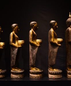 Ideal for connoisseurs of Burmese Buddhist art, spiritual interiors, or museum-quality collections, this ensemble offers a compelling blend of form, faith, and finesse. Whether viewed individually or as a group, the statues invite the observer into a quiet ritual of mindfulness—frozen in wood and gold, yet deeply alive.