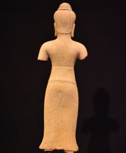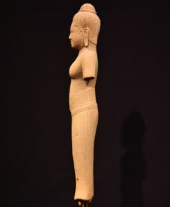 Carved from enduring sandstone, this statue exemplifies the sculptural elegance of the Angkorian period. Its calm, meditative facial expression reflects the Khmer artisans’ ability to capture serenity and divine presence, making it a remarkable piece of both historical and spiritual significance. The proportions are harmonious, exhibiting the characteristic Khmer aesthetic of balance and idealized form.