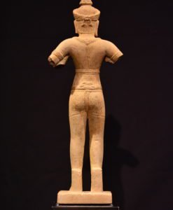 Though partially worn, the calm and composed facial expression reflects the Angkorian sculptural tradition of depicting deities with a sense of divine serenity and wisdom. The slightly downcast eyes symbolize compassion and enlightenment, qualities highly revered in both Hinduism and Buddhism. The broad shoulders and well-defined torso further exemplify the idealized human form celebrated in Khmer art.