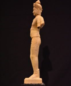 Crafted from sandstone, the preferred medium of Angkorian sculptors, this piece has withstood the test of time, bearing the subtle patina of centuries. The aged surface and natural discoloration only enhance its authenticity, marking it as a relic of a glorious past. While minor scratches from excavation are present, the statue has undergone restoration, ensuring its preservation while maintaining its integrity as an ancient artifact.